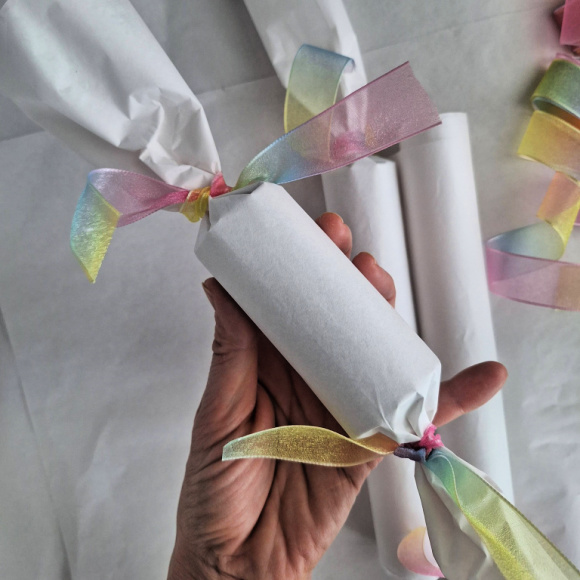 Målet er å ikke bruke mer penger på gavene, enn jeg hadde gjort på brus og godteri. Da gjelder det å være kreativ! I år pakker jeg smågavene inn i doruller rullet inn i silkepapir som jeg har fått på en blomsterbutikk.