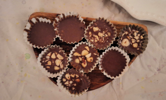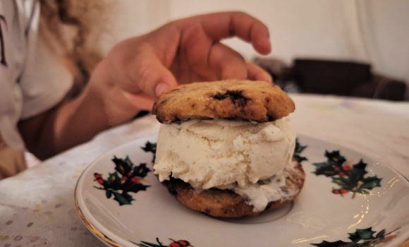 Til dessert bakte jeg cookies som jeg fylte med cashew-basert vanilje-is, og satt frem raw sjokolade med hasselnøtter.
