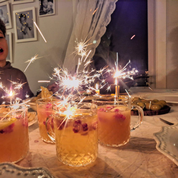 Middagen startet med nyttårs-drinker av ingefær-kombucha, og isbiter med granateple og sitron <3