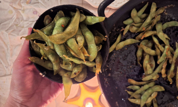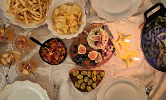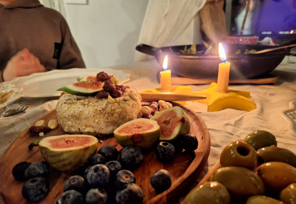 Middagen! Barnas favoritter; edemame-bønner med ingfær og chili, fries med havsalt, chips med eddik og salt (merket REAL som finnes på mange helsekoster), min datters favoritt tomat-salat, og marinerte oliven. Og min favoritt; hjemmelaget cashew-ost med frukt og nøtter.