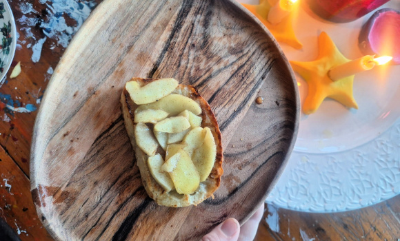 Til sen frokost lagde jeg Arme Riddere med varme epler. Jeg brukte hjemmebakt grytebrød som jeg hadde i fryseren, og dyppet skivene i en blanding av kokosmelk, malte linfrø, kardemomme og vanilje, og stekte de i litt kokosolje. Eplene laget jeg av epler i tynne skiver, som jeg varmet med kanel, vanilje og litt lønnesirup i panna.