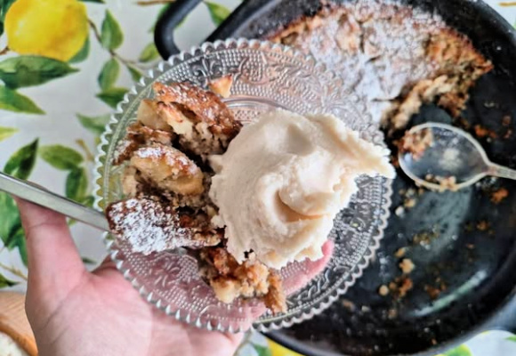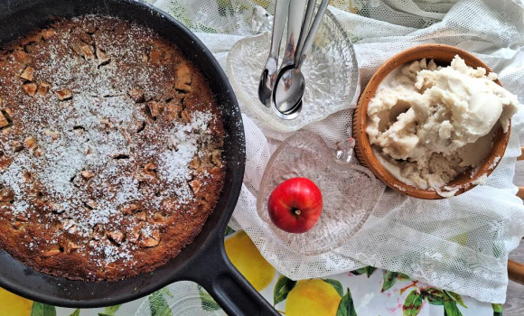 Hei søndag! Vi har hatt en så fin helg, med besøk av barnas venner på fredag, møte med gode venner i går, og i dag har det bare vært oss i familien. Vi har gått tur i deilig friskt vær, og bakt eplekake sammen. Denne eplekaken ble så, så, så god, og vi elsket den alle sammen. Siden den er bakt med mandelmel, er den naturlig glutenfri. Den er bakt med lønnesirup, og er selvsagt vegansk. Denne kommer vi til å bake igjen. Jeg laget hjemmelaget vanilje-is til, basert på manelmelk og kokoskrem.