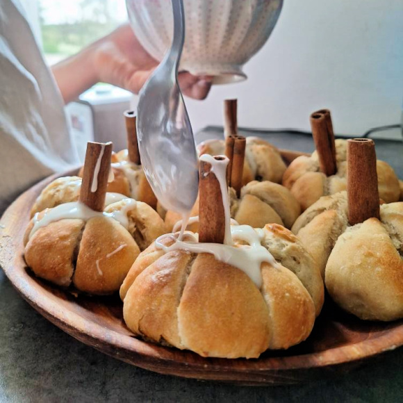Avkjøl bollene på rist. Klipp bort hyssingene. Stikk en kanel-stang i midten av hver bolle, og pynt med melis-glasur. Server <3