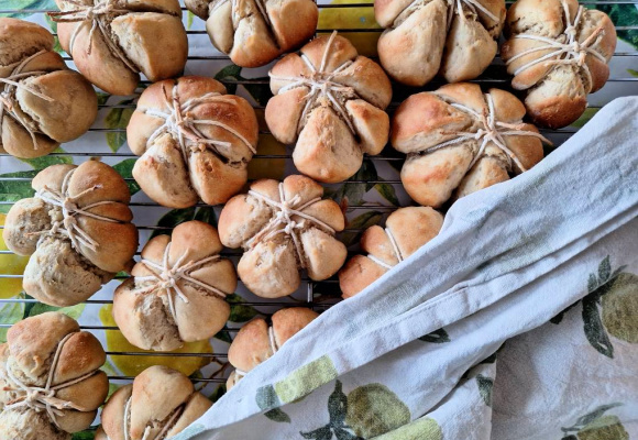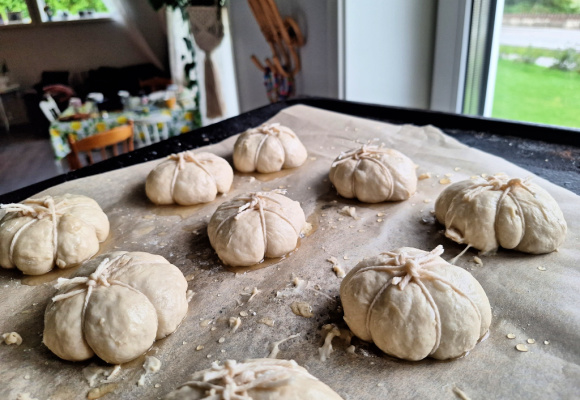 Klipp til 3 hyssing-biter til hver bolle (så 72 biter, hvis du baker 24 boller). Legg 3 hyssingbiter i et kryss. Trill ut en bolle, og legg den midt i krysset. Knyt hyssingene sammen på toppen, og sett bollen på stekkebrettet. Fortsett til du har bakt ut alle bollene. La de heve i ca en time.