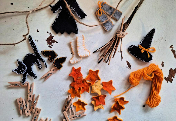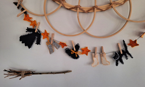 Det er enkelt å lage denne dekorasjonen. Tegn opp klesvasken på et papir. Jeg tegnet hatt, kjole, bukse, strømper, sko, og en katt. Før over mønsteret på filt, og klipp de ut. Bruk tråd i ønsket farge, og sy tungesting/knapphullssting langs kantene.