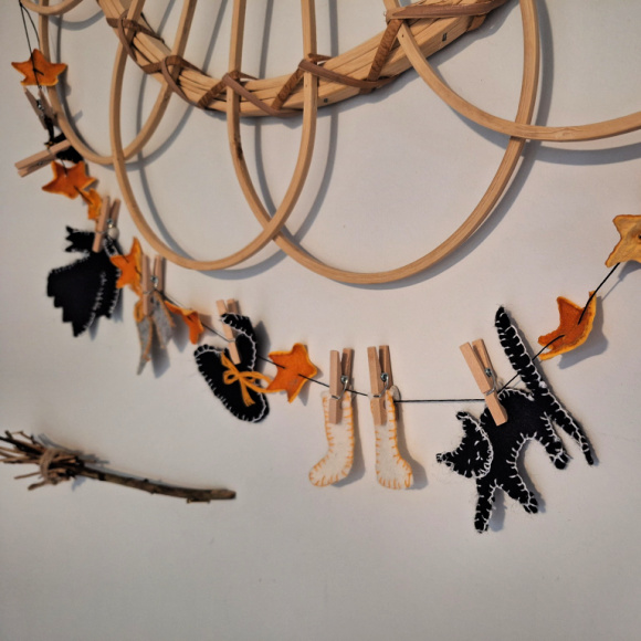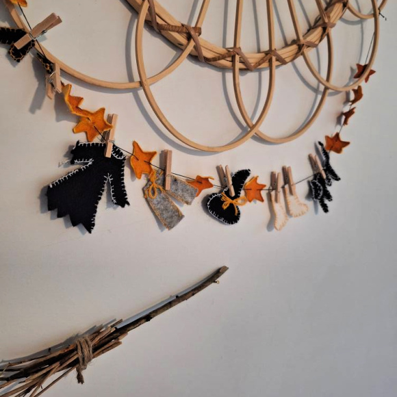 De sister dagene har jeg laget denne lille dekorasjonen som jeg har hengt opp i gangen. Det er heksa sin klesvask, hengt opp med bittesmå klesklyper, sammen med stjerner jeg laget av klementin-skall som jeg tørket, og en liten kost som jeg laget av små kvister.