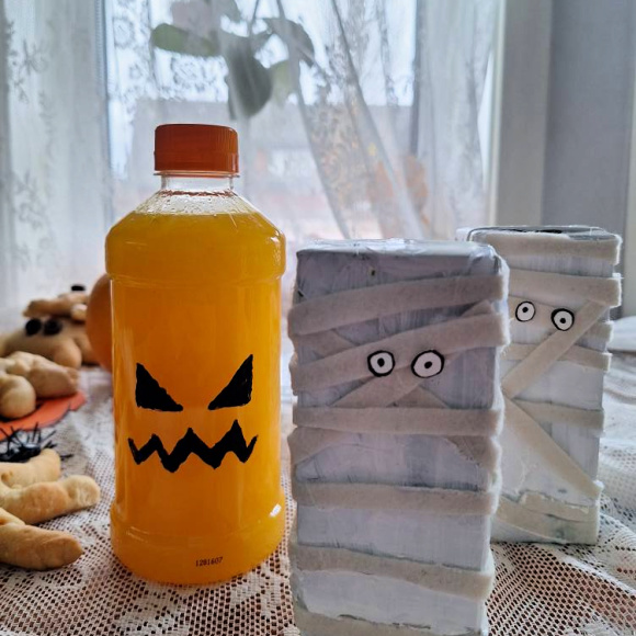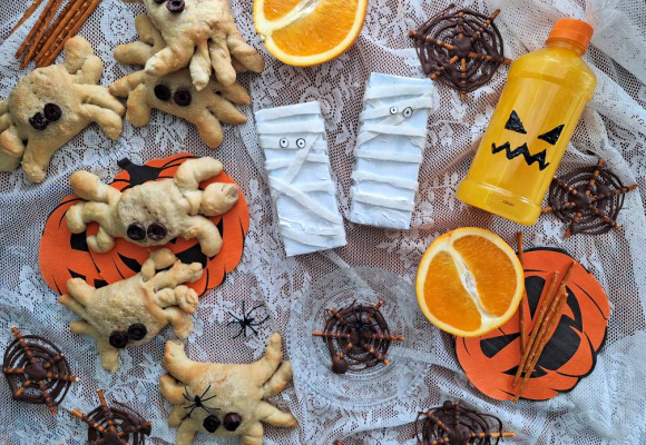 Innbakte edderkopp-brød med tyrkisk tofu-fyll, juice pyntet som gresskar og mumier, spindelvev av saltstenger og sjokolade, og oransje frukt.