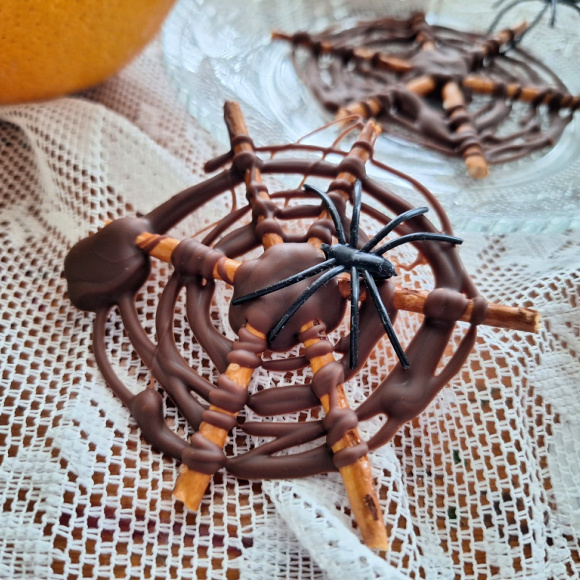 Edderkopp-spinn lages enkelt av saltstenger og smeltet sjokolade. Det finnes økologiske saltstenger på mange helsekoster, jeg fant disse hos Fat og Fe her i Sandefjord. Som sjokolade brukte jeg “melkesjokolade” fra Nomo.