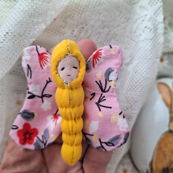 Jeg holder på å sy små sommerfugl-dukker til å henge i vinduet nå i vår og sommer. Hvor vårligere er ikke de? Så varme og gode og se på <3