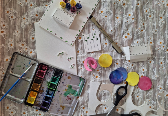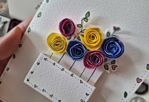 Den siste tiden har jeg laget kort med blomster som jeg lager av papir. De er så enkle å lage. Klipp ut sirkler av papir, og mal de på begge sider. Klipp hver sirkel til en spiral, og begynn å rull spiralene til blomster. Bruk limpistol for å feste de. Så enkelt!